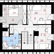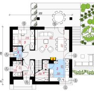 Parter - salon z aneksem kuchennym, pokój, kotłownia z pralnią, spiżarnia, łazienka, wiatrołap.