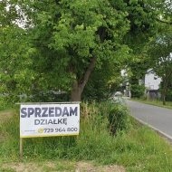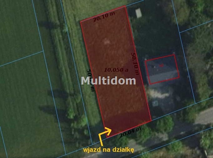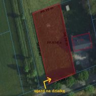 Działka o kształcie prostokątnym 20x50 metrów przy drodze asfaltowej.